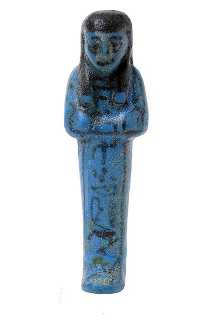 La figura mummiforme indossa una parrucca tripartita dipinta in nero ed un collare. Le mani, opposte incrociate, tengono ciascuna una zappa. Sulla schiena si trovano al centro una sacca ed ai lati un bilanciere con due fiaschette. Tutti i dettagli, iscrizione compresa, sono resi in nero. Dell'iscrizione, costituita da una colonna che si legge da destra a sinistra sul davanti delle gambe, rimane solo la parte iniziale: L'illuminato, l'Osiride K… . La statuina può essere datata tra la fine del Nuovo Regno e il Terzo Periodo Intermedio.