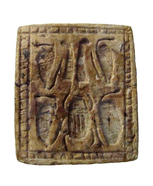 Amuleto in faience, in forma di piastrina rettangolare. Su una faccia vi è il volto del dio Bes, con la barba, le orecchie sporgenti, il largo naso piatto e le sopracciglia accentuate, con in capo la corona di piume di struzzo; sull'altra faccia, invece, uno scarabeo sormontato da due piume di struzzo si trova tra due coppie di urei, disposti araldicamente. L'amuleto ha un foro passante verticale.