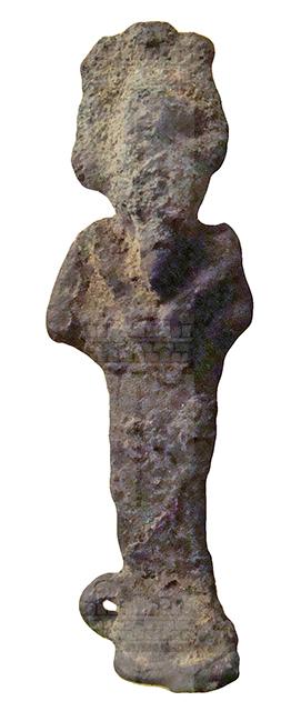Amuleto in bronzo raffigurante il dio Osiride. Secondo la consueta iconografia, il dio è raffigurato stante, con il corpo mummiforme da cui escono solo le mani, che reggono scettro e flagello, e la testa, sulla quale vi è la corona atef. Non si distingue granché, ma al mento vi è la solita barba divina posticcia. Dietro la schiena e in corrispondenza delle caviglie, sul lato destro, vi sono due anelli di sospensione.