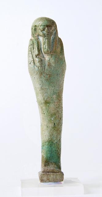 Statuina funeraria mummiforme che indossa una parrucca tripartita, la quale continua dietro direttamente con il pilastro dorsale e con la piccola base, e la barba divina. Le mani incrociate tengono a sinistra una zappa e a destra un piccone. Dalla spalla sinistra pende una sacca. I piedi sono appena accennati. L'iscrizione è disposta in colonna sul pilastro dorsale.