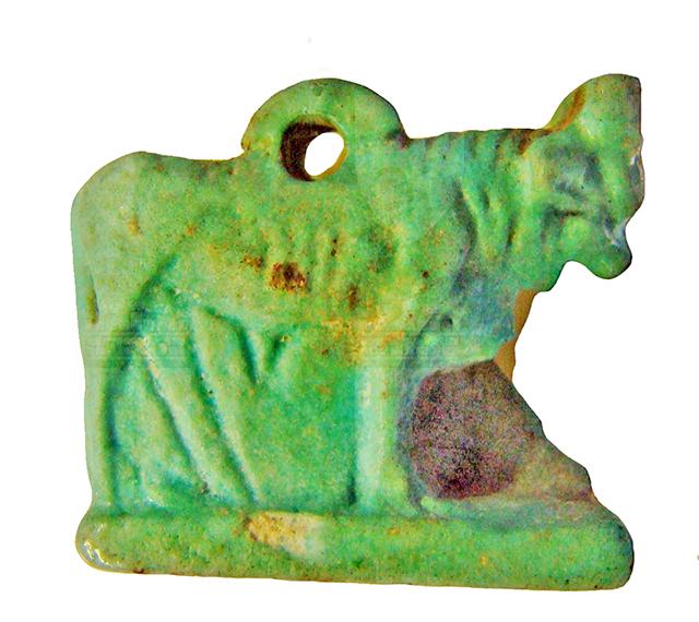 Amuleto in faience lavorato a tutto tondo, con presa forata nella parte superiore. Raffigura un toro andante, con le zampe che poggiano su una piccola base. Lo spazio tra le zampe è stato lasciato pieno, a causa della minutezza dell'oggetto, e i dettagli sono resi da linee incise.