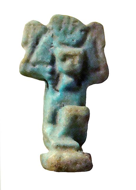 Amuleto in faience raffigurante il dio dell'aria Shu. Il dio è raffigurato inginocchiato, con indosso un gonnellino e con le braccia alzate simmetricamente a reggere un disco solare sopra il capo. I piedi poggiano su una piccola base parallelepipeda, che dietro si sviluppa nel pilastro dorsale, forato per permettere la sospensione dell'amuleto.