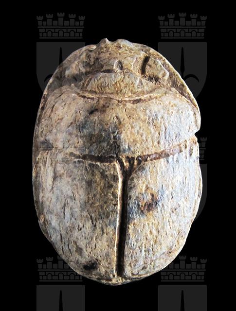 Scarabeo in steatite grigia, con sul ventre incisione di segni geroglifici disposti simmetricamente: si riconoscono due urei con lunga coda ai lati di un vaso hes. Dorso con clipeo ed incisione a T che divide il protorace dalle elitre. Foro passante longitudinale.