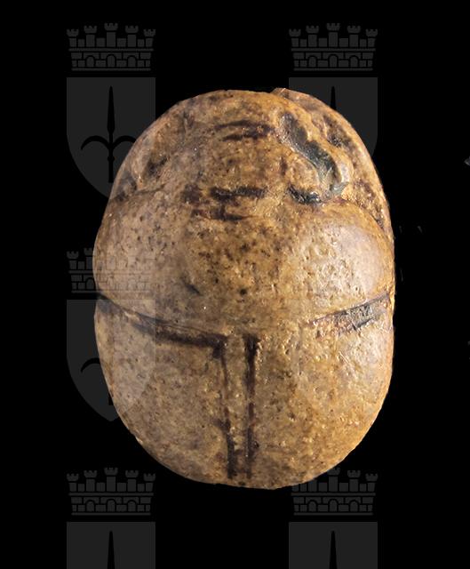 Scarabeo in steatite grigiastra con sul ventre incisione di segni geroglifici, molto consumati, all’interno di una cornice ovale; si possono interpretare come Men-maat-ra, prenome di Sethi I. Dorso con clipeo sulla testa e incisione a T che separa il protorace dalle elitre. Foro passante longitudinale.