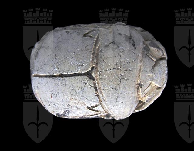 Scarabeo in steatite grigia con sul ventre una rappresentazione del faraone con la corona bianca dell’Alto Egitto genuflesso tra due divinità femminili che reggono lo scettro uag. Dorso con clipeo stilizzato, doppia divisione orizzontale tra protorace ed elitre, piccola incisione a V sopra la divisione delle elitre e tacche a V laterali. Foro passante longitudinale.