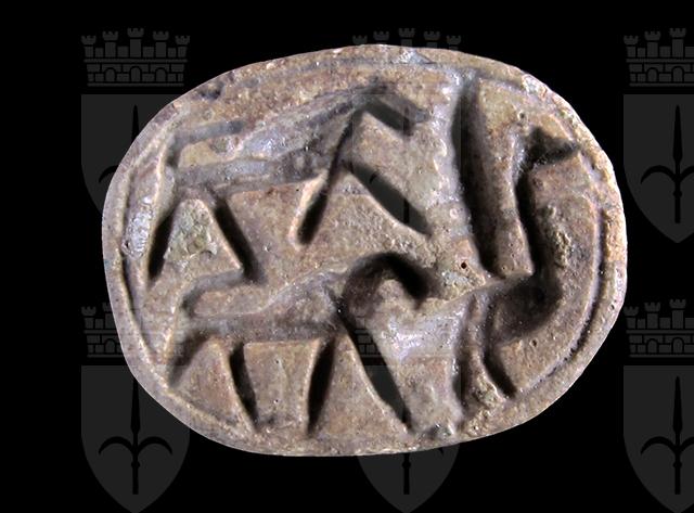 Scarabeo in steatite grigia con, sul ventre, rappresentazione di due leoni sovrapposti e di un’anatra con le ali spiegate. Il dorso è molto stilizzato, con semplice clipeo ed incisione a T che separa protorace ed elitre. Foro passante longitudinale.