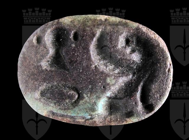 Scaraboide in faience; Sul ventre è rappresentata una sfinge alata con accanto segni geroglifici. Il dorso è molto consumato ed ormai liscio; il colore originale doveva essere verde chiaro. Foro passante longitudinale.