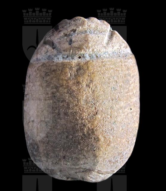 Scarabeo in steatite grigia con sul ventre rappresentazione di un uomo che tiene due coccodrilli per la coda. Dorso con lavorazione del clipeo e incisione a T che separa protorace ed elitre. Foro passante longitudinale.