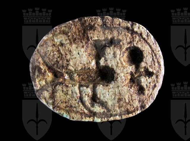 Scarabeo in steatite grigia con sul ventre ncisione crittografica del nome di Amon-Ra. Dorso con clipeo elaborato, protorace ed elitre arrotondate separati da incisione a T; in basso visibile lo scutello. Foro passante longitudinale.