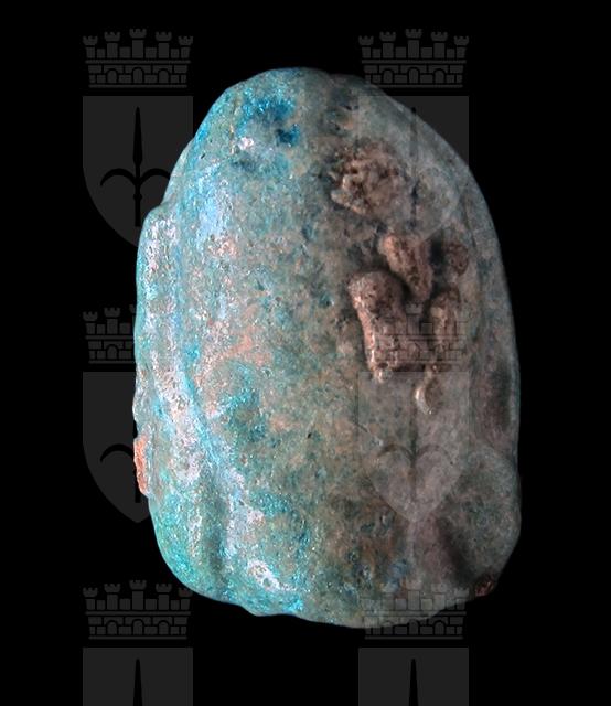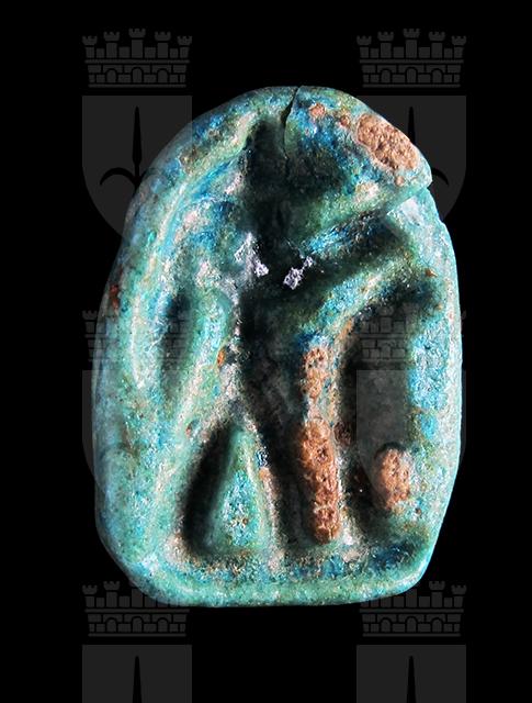 Scaraboide in faience turchese con sul ventre figura di divinità con probabile testa di sciacallo e piuma. Dorso a forma di pesce, probabilmente una Tilapia nilotica, simbolo di rigenerazione. Foro passante longitudinale.