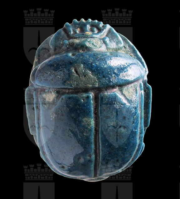 Scarabeo anepigrafe in faience blu. Dorso che presenta il clipeo e l’incisione a T che separa il protorace dalle elitre, sulle quali sono visibili tacche a V. Sui bordi esterni si vedono le zampe ripiegate. Senza foro.