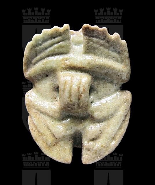 Scarabeo zoomorfo in faience verde. Dorso con clipeo e lavorazione ondulata sulla testa, visibile anche dal ventre; elitre non separate, con zigrinature verticali. Ventre con le zampe ripiegate ed una piccola presa trasversale al centro.