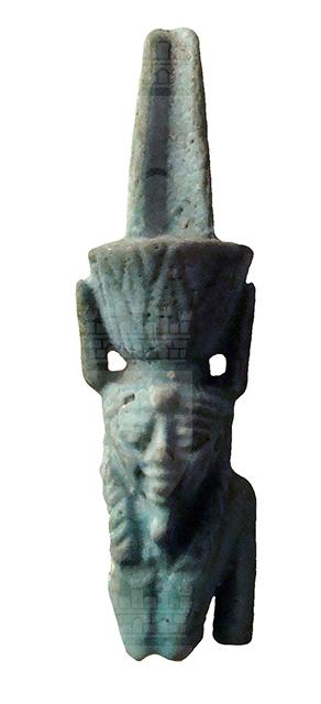 Amuleto in faience del dio Nefertum, divinità legata al profumo ed al fiore del loto azzurro. Il dio è riconoscibile per il suo tipico diadema: un fiore di loto da cui spuntano due alte piume diritte. Purtroppo la figurina è spezzata all'altezza della vita e anche il braccio destro è mancante, ma sul retro si vede il pilastro dorsale forato, per permettere la sospensione.