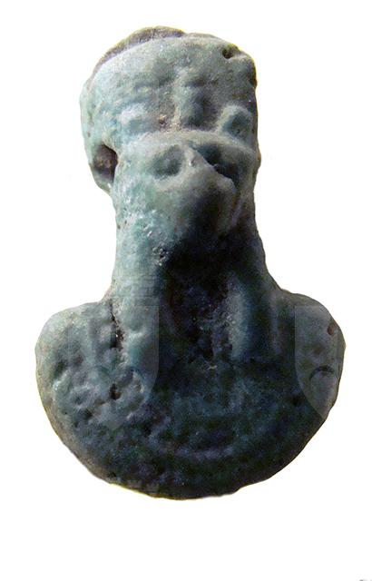 Amuleto in faience che raffigura il busto della dea Sekhmet, nella forma normalmente detta "egida" (a imitazione degli stendardi usati nei templi della dea): il volto leonino della dea è frontale, e l'amuleto è caratterizzato dall'ampio collare semicircolare, ornato da incisioni geometriche. Sul capo vi è il consueto disco solare con ureo.