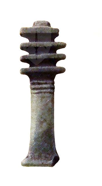 Amuleto in faience, con pilastro dorsale forato, che raffigura il geroglifico "djed", a forma di pilastro con quattro espansioni nella parte superiore, che indica stabilità, immutabilità, eternità, resurrezione, ma anche forza inestinguibile ed incorruttibilità. Già nella Prima Dinastia (3150 – 2925 a.C.) era un pilastro intorno al quale venivano legate spighe di grano; dal Nuovo Regno (1543 – 1078 a.C.) fu interpretato anche come spina dorsale di Osiride. Un djed, meglio se in oro, era posto sulla gola del defunto durante il suo funerale, con il compito di farlo divenire uno spirito santificato e perfetto, un seguace di Osiride. Nel capitolo 155 del Libro dei Morti l’amuleto fa sì che “è tua nuovamente la tua spina dorsale e le tue vertebre, così che puoi tornare a muoverti...”.
