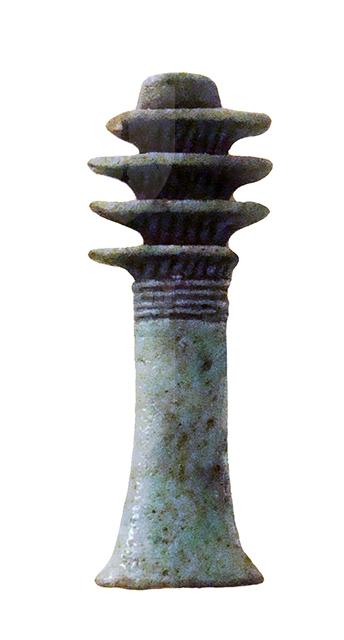 Amuleto in faience, con pilastro dorsale forato, che raffigura il geroglifico "djed", a forma di pilastro con quattro espansioni nella parte superiore, che indica stabilità, immutabilità, eternità, resurrezione, ma anche forza inestinguibile ed incorruttibilità. Già nella Prima Dinastia (3150 – 2925 a.C.) era un pilastro intorno al quale venivano legate spighe di grano; dal Nuovo Regno (1543 – 1078 a.C.) fu interpretato anche come spina dorsale di Osiride. Un djed, meglio se in oro, era posto sulla gola del defunto durante il suo funerale, con il compito di farlo divenire uno spirito santificato e perfetto, un seguace di Osiride. Nel capitolo 155 del Libro dei Morti l’amuleto fa sì che “è tua nuovamente la tua spina dorsale e le tue vertebre, così che puoi tornare a muoverti...”.