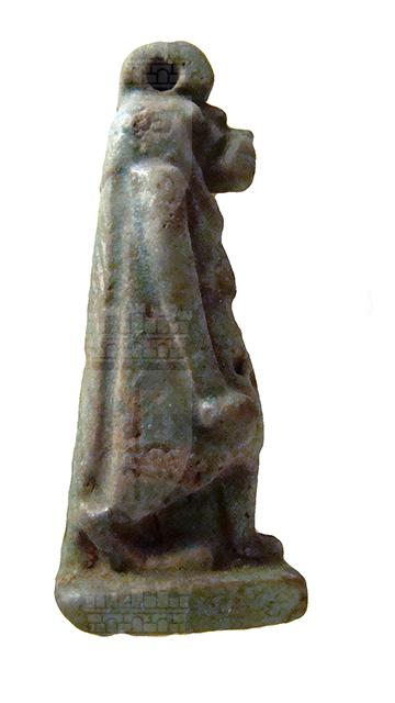 Amuleto in faience raffigurante la divinità apotropaica Toeris, patrona delle partorienti e dei neonati. La dea è raffigurata in piedi, con il muso di coccodrillo, una lunga parrucca, il corpo da ippopotamo gravido, con le braccia distese lungo il corpo. I piedi poggiano su una base parallelepipeda, mentre il dorso con la coda da coccodrillo si fonde con il pilastro dorsale. Sulla testa è presente un anello di sospensione.