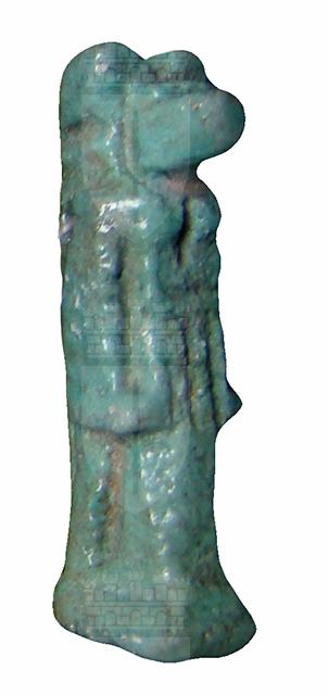 Amuleto in faience raffigurante il dio Anubi. Il dio dalla testa di sciacallo è raffigurato in piedi, nell’atto di camminare (con la gamba destra in avanti) e con le braccia stese lungo i fianchi; le mani sono chiuse a pugno. Le orecchie sono molto evidenti, così come il muso canino allungato. Indossa un corto gonnellino pieghettato. Data la minutezza della figura, i piedi poggiano su una piccola base parallelepipeda, mentre sul retro vi è il pilastro dorsale, che presenta un foro passante.
