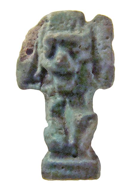Amuleto in faience raffigurante il dio dell'aria Shu. Il dio è raffigurato inginocchiato, con indosso un gonnellino e con le braccia alzate simmetricamente a reggere un disco solare sopra il capo. I piedi poggiano su una piccola base parallelepipeda. All'altezza della testa è stato ricavato un foro passante.