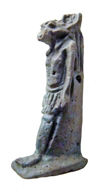 Amuleto in faience raffigurante il dio Anubi. Il dio dalla testa di sciacallo è raffigurato in piedi, nell’atto di camminare (con la gamba destra in avanti) e con le braccia stese lungo i fianchi; le mani sono chiuse a pugno. Le orecchie sono molto evidenti, così come il muso canino allungato. Indossa un corto gonnellino pieghettato. Data la minutezza della figura, i piedi poggiano su una piccola base parallelepipeda, mentre sul retro vi è il pilastro dorsale, che presenta un foro passante.