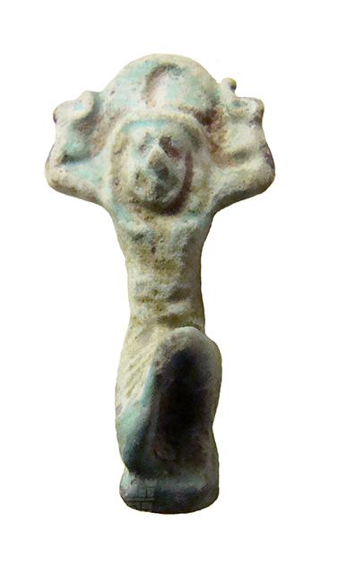 Amuleto in faience, dal modellato alquanto naturalistico, raffigurante il dio dell'aria Shu. Il dio è raffigurato inginocchiato, con indosso un gonnellino e con le braccia alzate simmetricamente a reggere un disco solare sopra il capo. I piedi poggiano su una piccola base parallelepipeda, che dietro si sviluppa nel pilastro dorsale, forato per permettere la sospensione dell'amuleto.