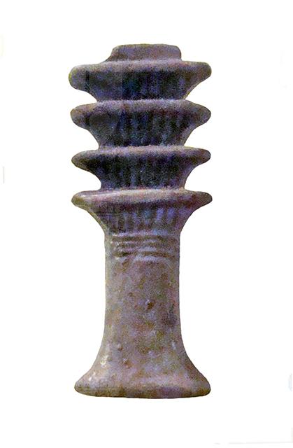 Amuleto in faience, con pilastro dorsale forato, che raffigura il geroglifico "djed", a forma di pilastro con quattro espansioni nella parte superiore, che indica stabilità, immutabilità, eternità, resurrezione, ma anche forza inestinguibile ed incorruttibilità. Già nella Prima Dinastia (3150 – 2925 a.C.) era un pilastro intorno al quale venivano legate spighe di grano; dal Nuovo Regno (1543 – 1078 a.C.) fu interpretato anche come spina dorsale di Osiride. Un djed, meglio se in oro, era posto sulla gola del defunto durante il suo funerale, con il compito di farlo divenire uno spirito santificato e perfetto, un seguace di Osiride. Nel capitolo 155 del Libro dei Morti l’amuleto fa sì che “è tua nuovamente la tua spina dorsale e le tue vertebre, così che puoi tornare a muoverti...”.