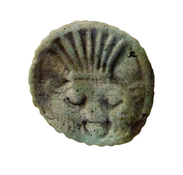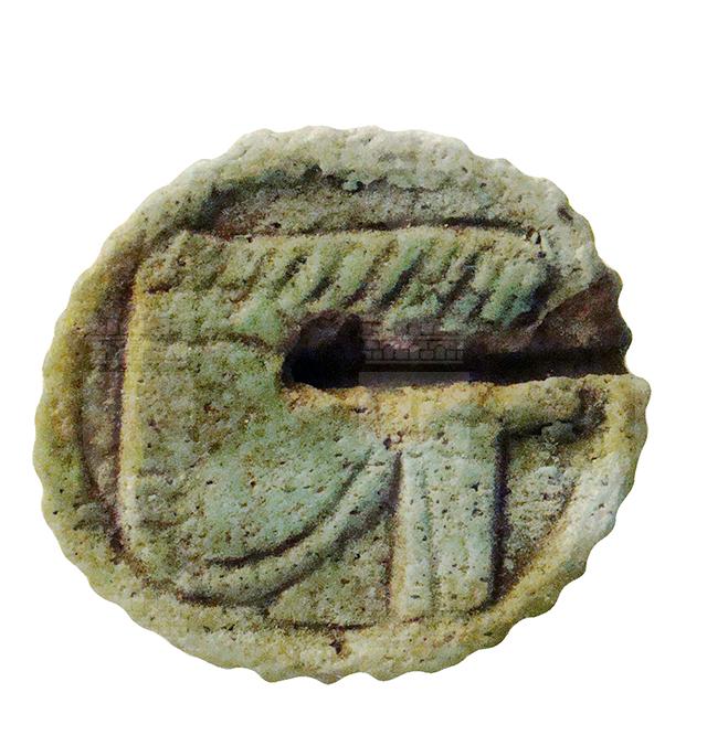 Piastrina circolare in faience, con bordo seghettato e foro passante, con funzione di amuleto. Raffigura su una faccia il volto della divinità apotropaica Bes, frontale con le orecchie sporgenti, le sopracciglia evidenziate, la barba e il grande naso piatto. Sul capo porta una corona di piume di struzzo. Sulla faccia opposta vi è l'immagine di un occhio udjat.
