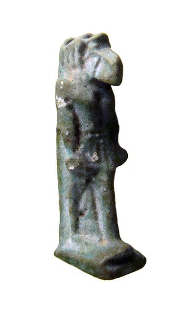 Amuleto in faience che raffigura il dio Thot, dio della sapienza e inventore dei geroglifici. Il dio è raffigurato in piedi, nell'atto di camminare (ha la gamba sinistra in avanti); la testa è quella dell'ibis, suo animale sacro, caratterizzata dal lungo becco a forma di falce lunare, con una parrucca che scende sul petto; le braccia sono stese lungo il corpo, con le mani chiuse a pugno; indossa un corto gonnellino pieghettato. I piedi poggiano su una base parallelepideda, che dietro si sviluppa nel pilastro dorsale, nel quale è stato ricavato un foro che permette la sospensione dell'amuleto.