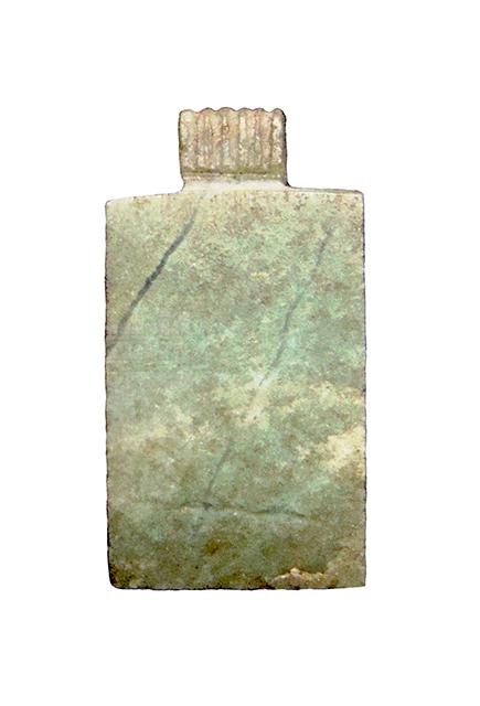 Amuleto in pietra lavorato a tutto tondo, raffigurante una tavoletta per scrivere liscia e rettangolare, con presa superiore priva del foro per la sospensione. Amuleti di questo tipo si diffusero a partire dalla XXVI dinastia (dal VII secolo a.C.).