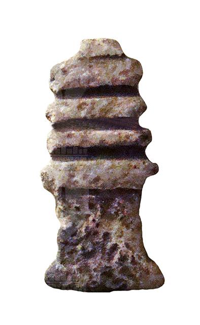 Amuleto in pietra, privo del foro di sospensione, che raffigura il geroglifico "djed", a forma di pilastro con quattro espansioni nella parte superiore, che indica stabilità, immutabilità, eternità, resurrezione, ma anche forza inestinguibile ed incorruttibilità. Già nella Prima Dinastia (3150 – 2925 a.C.) era un pilastro intorno al quale venivano legate spighe di grano; dal Nuovo Regno (1543 – 1078 a.C.) fu interpretato anche come spina dorsale di Osiride. Un djed, meglio se in oro, era posto sulla gola del defunto durante il suo funerale, con il compito di farlo divenire uno spirito santificato e perfetto, un seguace di Osiride. Nel capitolo 155 del Libro dei Morti l’amuleto fa sì che “è tua nuovamente la tua spina dorsale e le tue vertebre, così che puoi tornare a muoverti...”.