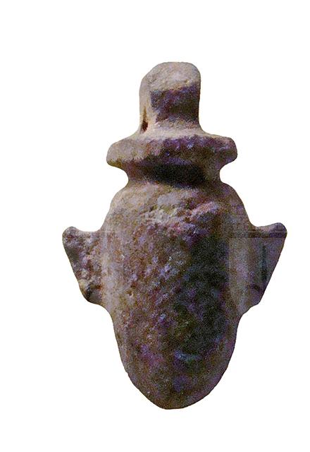 Amuleto in pietra lavorato a tutto tondo, con presa forata nella parte superiore. Raffigura il geroglifico "ib", vale a dire il "cuore", con la massa ovoide centrale e le terminazioni dei tre vasi sanguigni (due sui lati e una in alto); vista l'importanza di quest'organo nel giudizio dei defunti nell'aldilà, un tale amuleto veniva posto tra le bende delle mummie per evitare che il vero cuore venisse rapito.