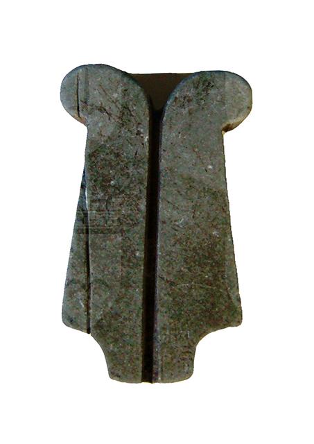 Amuleto in pietra, bidimensionale, che raffigura mediante incisione, su di una faccia, una coppia di piume di struzzo disposte simmetricamente e riconoscibili per la base tagliata diagonalmente e la sommità tondeggiante e rigonfia. Il lato posteriore è liscio. L'amuleto è privo di foro per la sospensione. La piuma di struzzo singola era l'emblema della dea Maat, garante della verità e della giustizia.