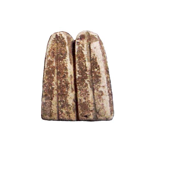 Amuleto in pietra, bidimensionale, che raffigura una coppia di penne di falco affiancate e riconoscibili per la nervatura centrale, la sommità arrotondata, mentre la base è diritta. L'amuleto è privo di foro per la sospensione. La piuma di del falco rimanda al dio solare Horus e alle corone divine in cui spesso compariva la coppia di penne come decorazione.