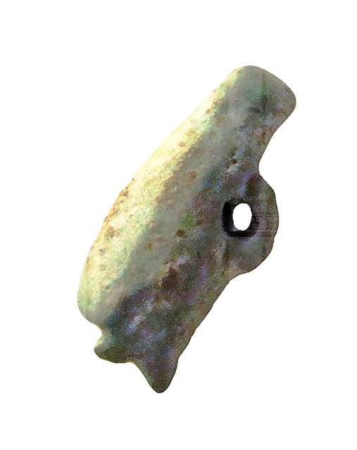 Amuleto in faience lavorato a tutto tondo, con anello di sospensione nella parte posteriore. Raffigura la corona bianca dell'Alto Egitto, simbolo di autorità nell'oltretomba (come quella che il faraone aveva in vita).