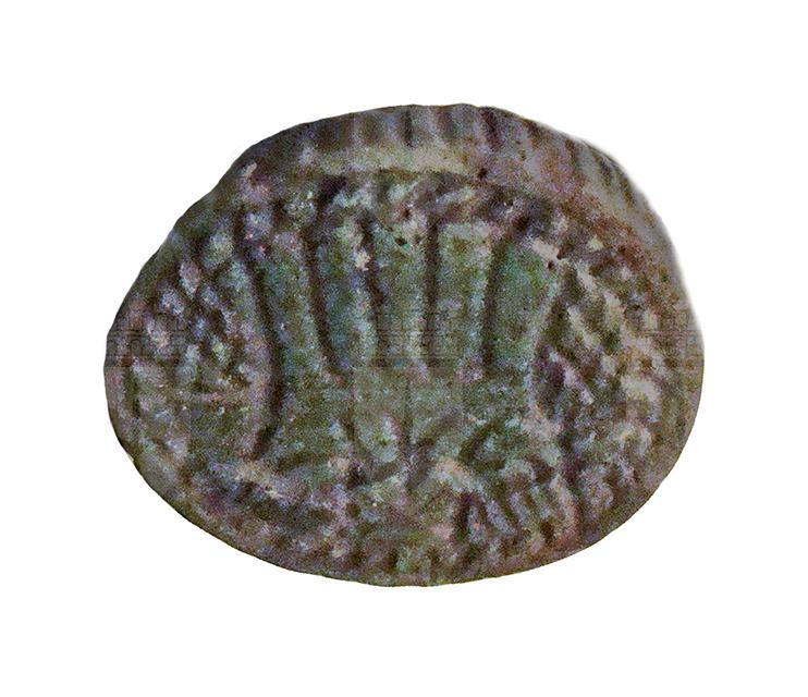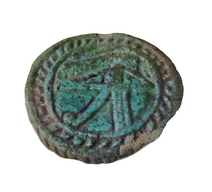 Piastrina circolare in faience, con bordo seghettato e foro passante, con funzione di amuleto. Raffigura, all’interno di una cornice con motivo a corda, su una faccia il volto della divinità apotropaica Bes, frontale con le orecchie sporgenti, le sopracciglia evidenziate, la barba e il grande naso piatto. Sul capo porta una corona di piume di struzzo. Sulla faccia opposta, sempre all’interno di una cornice uguale all’altra, vi è l'immagine di un occhio udjat.