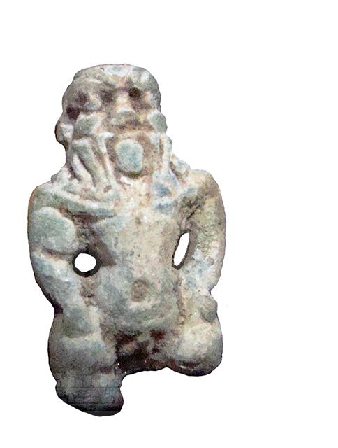 Amuleto in faience raffigurante la divinità apotropaica Bes. Il dio è raffigurato nel suo aspetto consueto: con il corpo tozzo e le gambe arcuate, le braccia appoggiate sulle cosce, il volto frontale con le orecchie sporgenti, le sopracciglia evidenziate, la barba e il grande naso piatto. Sul capo porta una corona di piume di struzzo, mentre i piedi poggiano su una piccola base quadrangolare. In questo esemplare danneggiato, tuttavia, mancano sia la corona che parte delle gambe.