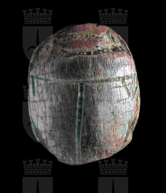 Scarabeo in steatite invetriata turchese con sul ventre incisione che rappresenta due divinità, con disco solare sopra il capo, che si tengono per mano. Dorso con incisione di clipeo, protorace ed elitre, sulle quali sono presenti tacche a V. Foro passante longitudinale.