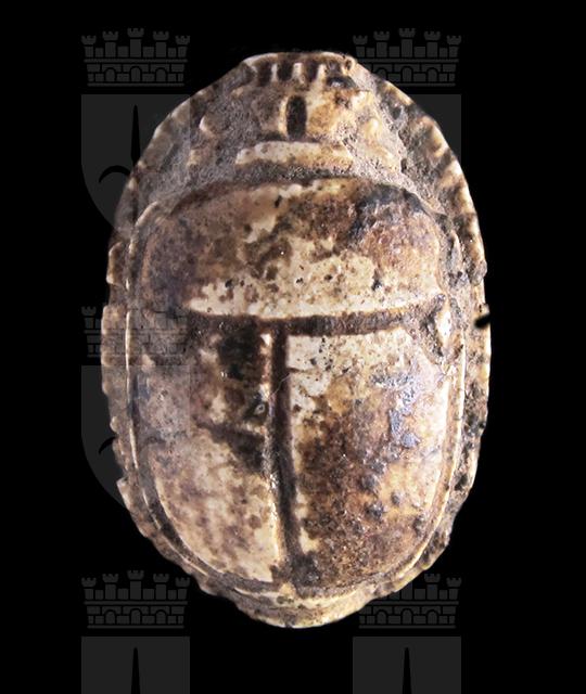 Scarabeo in steatite grigia con sul ventre una rappresentazione del faraone inginocchiato in atto di adorazione davanti al dio Thot in forma di babbuino. Sopra di essi dei segni geroglifici non leggibili, probabilmente il nome del sovrano. Dorso con clipeo sulla testa e incisione a T che separa il protorace dalle elitre, sulle quali sono incise tacche a V; in basso è visibile lo scutello. Foro passante longitudinale.
