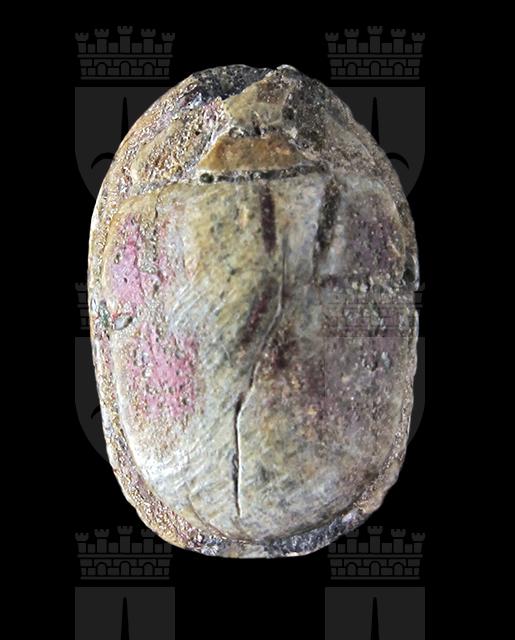Scarabeo in steatite grigia, con sul ventre incisione di motivo geometrico con schema a croce, alle cui estremità vi sono dei fiori di loto. Sul dorso è segnata solo la testa con il clipeo. Foro passante longitudinale.
