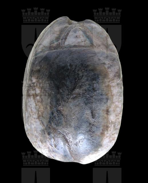 Scarabeo in steatite grigia con sul ventre incisione del cartiglio davanti ad un ureo; sopra ci sono due fiori di loto e sotto un segno neb. Il nome nel cartiglio è quello di intronizzazione di Apopi I, faraone della XV dinastia (1630-1530 a.C ). Dorso molto semplice: è visibile un’unica incisione a V sulla testa, in funzione di clipeo. Foro passante longitudinale.