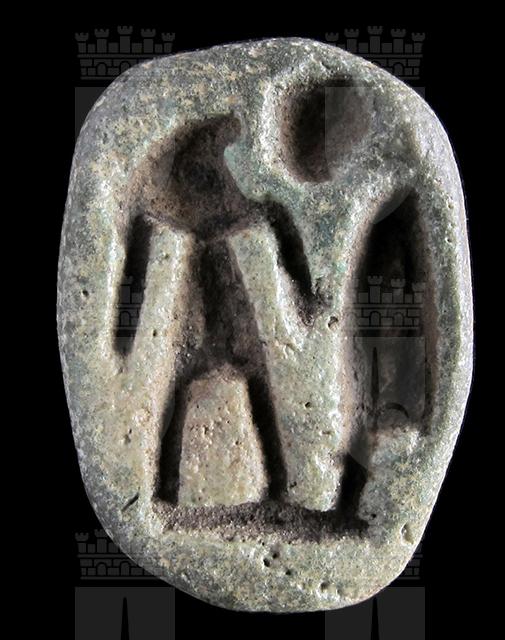 Scaraboide in faience con sul ventre rappresentazione di divinità con disco solare e piuma. Dorso con incisione di una scimmia che suona uno strumento a fiato, con un elemento decorativo vegetale davanti (capovolto rispetto alla decorazione del ventre). Il colore originale doveva essere azzurro. Foro passante longitudinale.