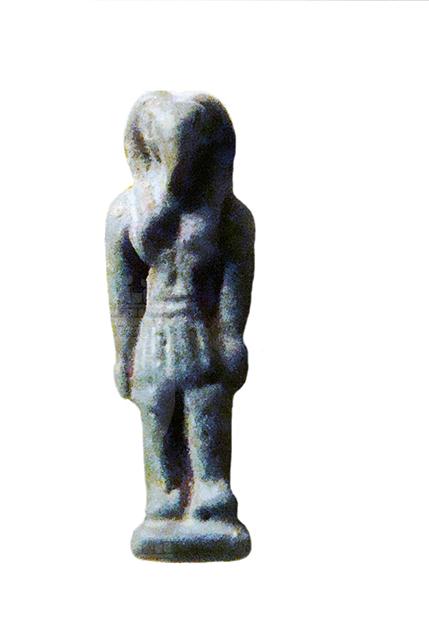 Amuleto in faience che raffigura il dio Thot, dio della sapienza e inventore dei geroglifici. Il dio è raffigurato in piedi, nell'atto di camminare (ha la gamba sinistra in avanti); la testa è quella dell'ibis, suo animale sacro, caratterizzata dal lungo becco a forma di falce lunare, con una parrucca che scende sul petto; le braccia sono stese lungo il corpo, con le mani chiuse a pugno; indossa un corto gonnellino pieghettato. I piedi poggiano su una base parallelepideda, che dietro si sviluppa nel pilastro dorsale, nel quale è stato ricavato un foro che permette la sospensione dell'amuleto.