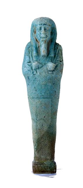 Statuina funeraria mummiforme che indossa la barba divina intrecciata e una parrucca tripartita, la quale continua dietro direttamente con il pilastro dorsale. Le mani incrociate, la destra sopra la sinistra, portano rispettivamente una zappa e un piccone. Dalla spalla sinistra pende una sacca. I piedi poggiano su una piccola base. L’ushabti è privo di iscrizioni.