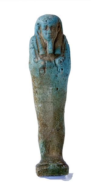 Statuina funeraria mummiforme che indossa una parrucca tripartita e la barba divina. Le mani incrociate e affiancate tengono a destra una zappa e a sinistra un piccone. Dalla spalla sinistra pende una sacca. Il pilastro dorsale e la base sono presenti. L’ushabti è privo di iscrizioni.