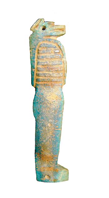 Amuleto in faience, dallo spessore così ridotto da risultare quasi una piastrina, che veniva cucito sulle bende delle mummie. Raffgura il profilo del corpo mummiforme del genio funerario Hapi, caratterizzato da una testa di babbuino, attraverso la quale vi è il foro per il fissaggio alle bende, mentre il secondo foro è visibile nella zona dei piedi.