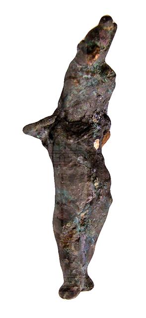 Amuleto in bronzo raffigurante il dio Arpocrate: il dio fanciullo è ritratto nudo, semidisteso. L'anatomia grassoccia lo associa alle raffigurazioni degli eroti di epoca ellenistica. I tratti iconografici che lo contraddistinguono si vedono a malapena, dato il cattivo stato di conservazione della superficie: la treccia infantile che scende sul lato destro del capo e il braccio destro piegato per portare l’indice alla bocca. Sul capo porta la corona doppia dell'Alto e Basso Egitto. Arpocrate è una divinità bambina il cui culto avrà molta fortuna nelle epoche finali della storia egiziana, ed è considerato figlio di Iside ed Osiride.