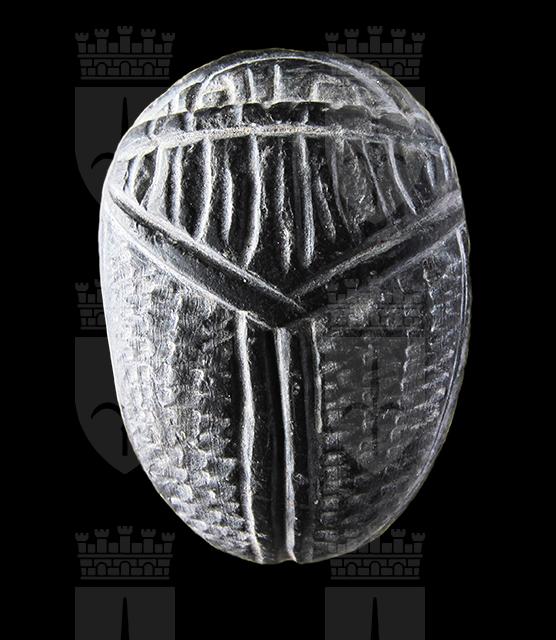 Scarabeo anepigrafe in basalto. Dorso stilizzato, sulla testa è appena accennato il clipeo. Si nota una doppia incisione a Y per dividere il protorace, che presenta delle striature verticali, dalle elitre, le quali mostrano una lavorazione ad onda. Senza foro. Autenticità dubbia.