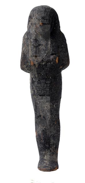 Statuina funeraria mummiforme, con parrucca tripartita. Le mani incrociate sul petto, affiancate, non recano attrezzi e non si vedono tracce di iscrizione.