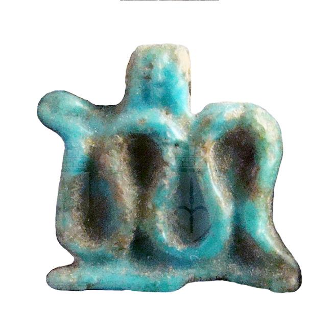 Amuleto in faience, modellato a rilievo, con anello di sospensione nella parte superiore. Raffigura un serpente dal corpo ondulato che forma tre spire sinuose, rivolto verso sinistra; il corpo del serpente poggia su una piccola base.