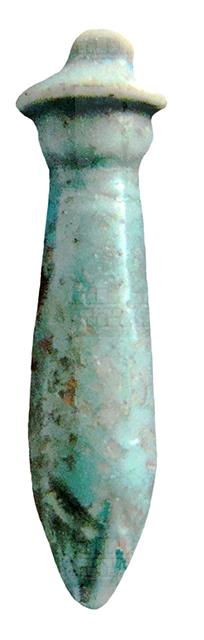 Amuleto in faience lavorato a tutto tondo e raffigurante un giovane stelo cilindrico di papiro con la base appuntita e con in cima la sua tipica infiorescenza a ombrello; al di sopra vi è la consueta presa forata per la sospensione. La decorazione è arricchita, alla base, da incisioni che indicano le foglie da cui nasce lo stelo. Normalmente, lo stelo di papiro così raffigurato è tenuto in mano come scettro dalle divinità femminili. Di colore verde o azzurro chiaro, allude alla gioventù e alla rinascita della vegetazione, rinascita che i defunti speravano di sperimentare nell'aldilà.